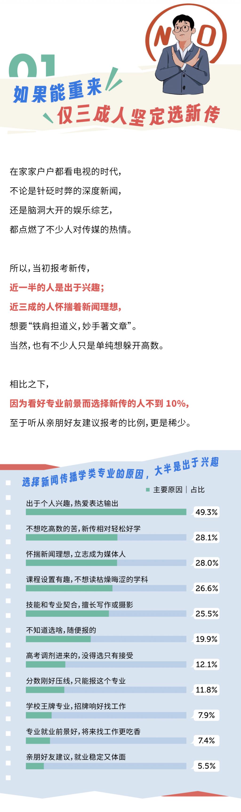 这份对专业的复杂感情,也体现在我们的调查中。求职时,六成人认可新传专业背景带来的文字功底和表达优势,把它当作加分项,但与此同时,近一半人又因为专业壁垒弱、易被替代而视其为减分项。如果能重来,只有 36.8% 的人还会坚定选择这个专业。