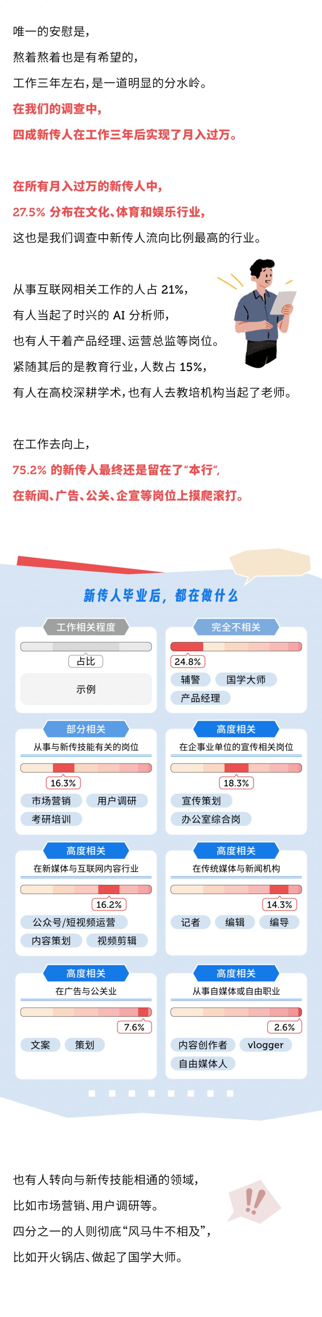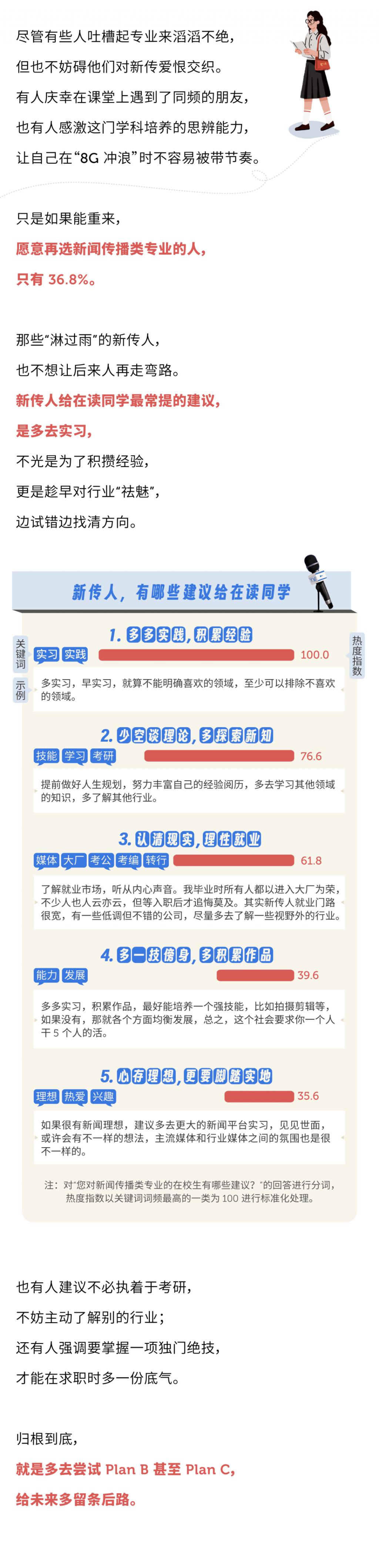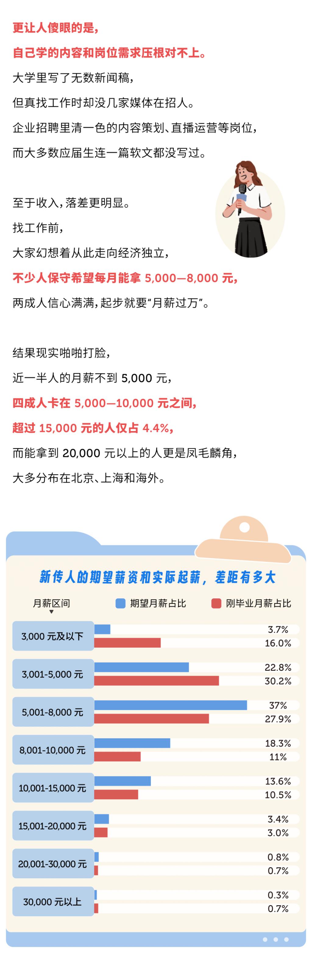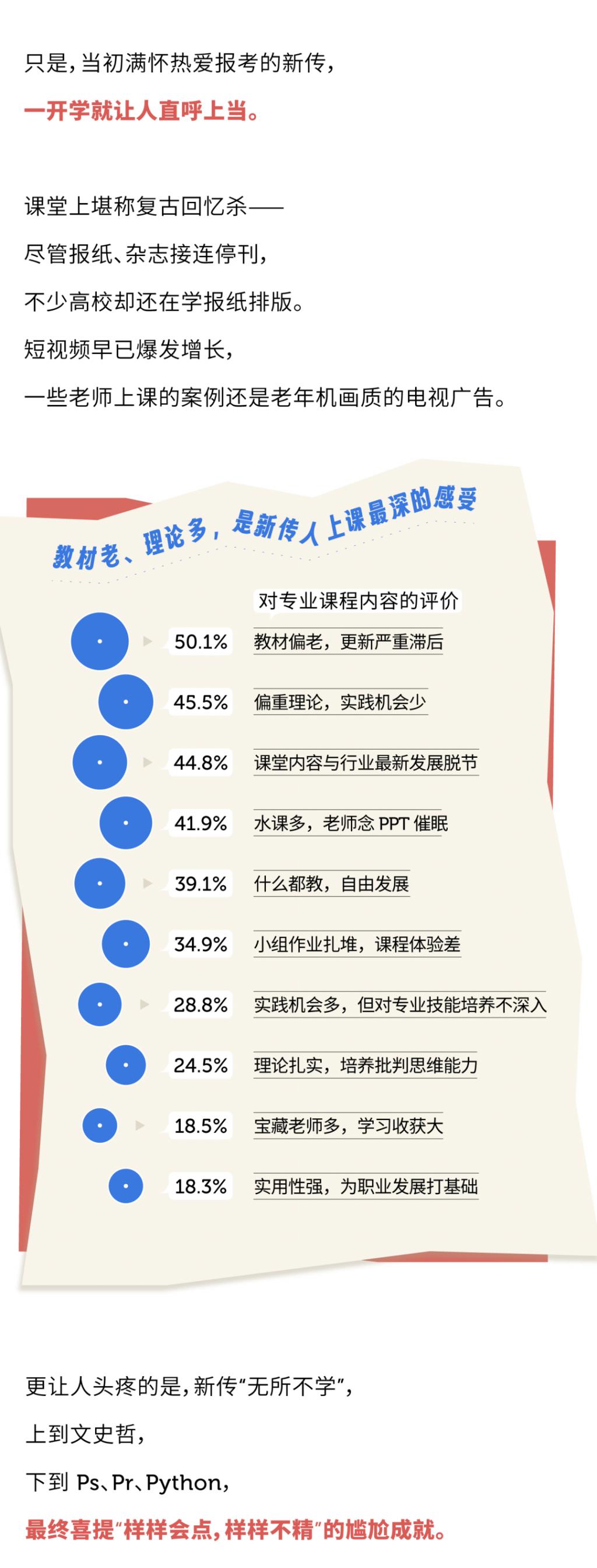 课堂里传授的是 " 铁肩担道义 " 的信条,但走出校园的象牙塔后,就业市场关心的往往是爆款和流量。这份落差,是许多新传人共同的困惑。很多人的一腔热血,也逐渐在现实中平静冷却。