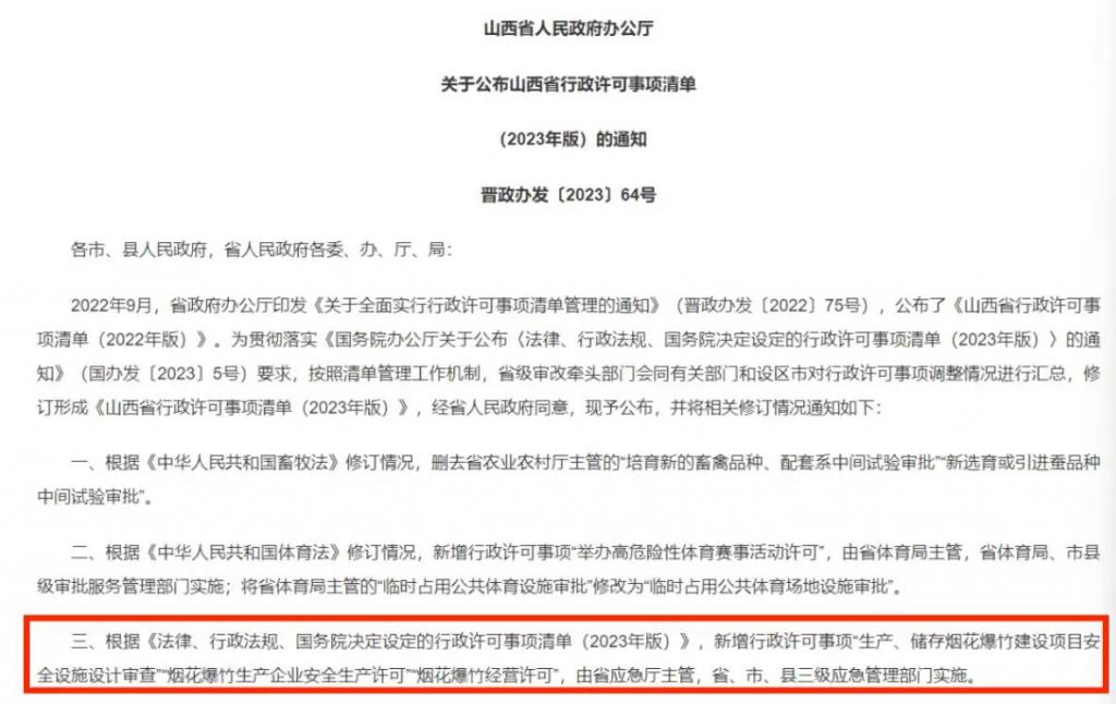 据山西当地媒体此前报道,山西省在烟花爆竹管理政策上此前已进行过调整,根据 2023 年 11 月 9 日发布的《山西省人民政府办公厅关于公布山西省行政许可事项清单 ( 2023 年版 ) 的通知》,山西省新增了一系列与烟花爆竹相关的行政许可事项,新增的行政许可事项包括 " 生产、储存烟花爆竹建设项目安全设施设计审查 "" 烟花爆竹生产企业安全生产许可 " 以及 " 烟花爆竹经营许可 "。这些许可事项由省应急厅主管,省、市、县三级应急管理部门负责实施。这一变化旨在强化对烟花爆竹产业的监管,保障生产、储存和经营过程中的安全。该公告意味着山西省对于烟花爆竹政策进行了更加细致和灵活的调整。