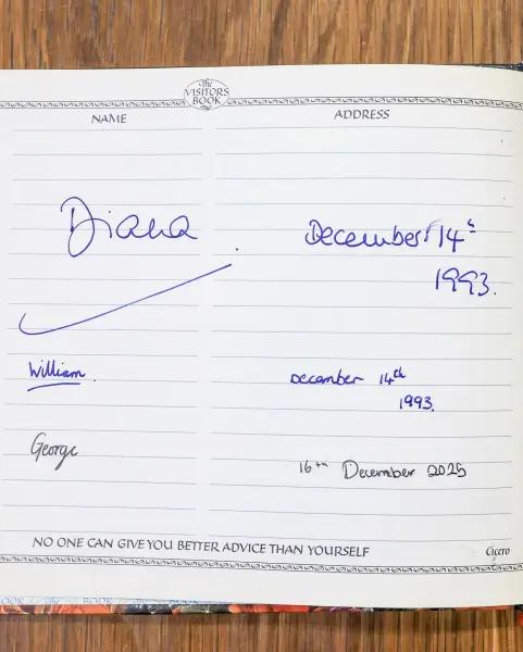 在该机构的签名簿上,有戴安娜王妃于 1993 年 12 月 14 日的签名,彼时尚未成年的威廉也签了名,比起母亲那自信洒脱的字迹,他的略显拘谨。