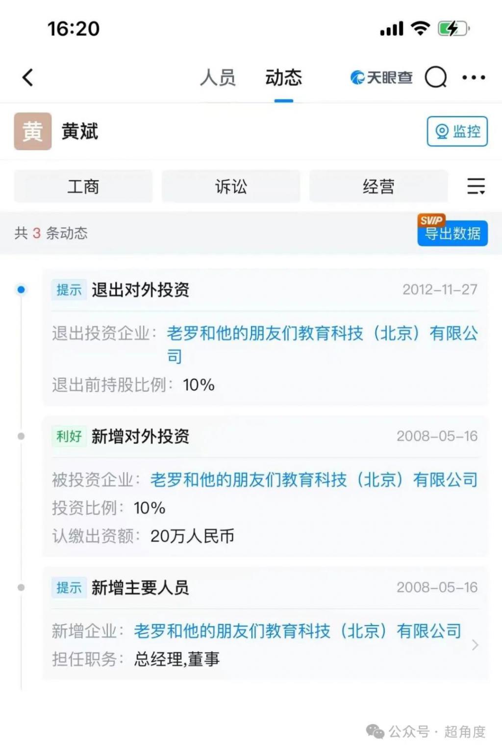 天眼查显示,黄斌在 2008 年 5 月投资 " 老罗和他的朋友们教育科技(北京)有限公司 ",占股 10%。在 2012 年退出该公司。该公司于 2017 年 3 月注销。