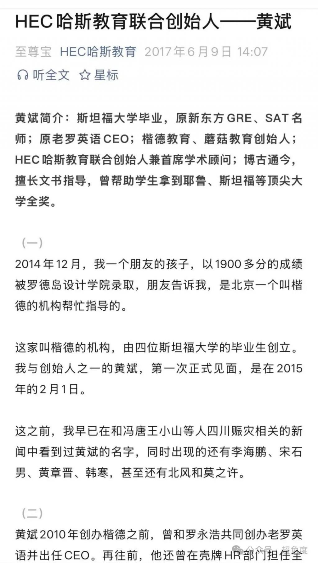 哈斯教育公众号介绍黄斌是原老罗英语 CEO,此外通过公众号黄斌的照片和微博黄斌视频对比,确认是同一个人。
