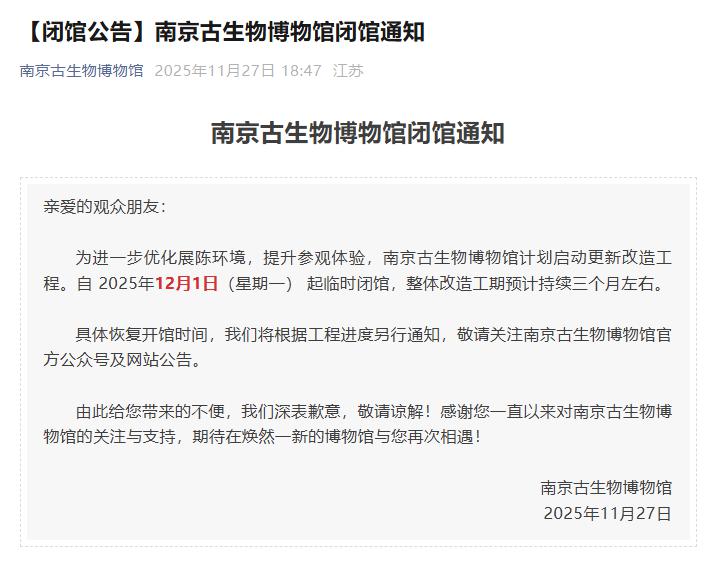 南京古生物博物馆计划启动更新改造工程,自 2025 年 12 月 1 日 ( 星期一 ) 起临时闭馆,整体改造工期预计持续三个月左右。