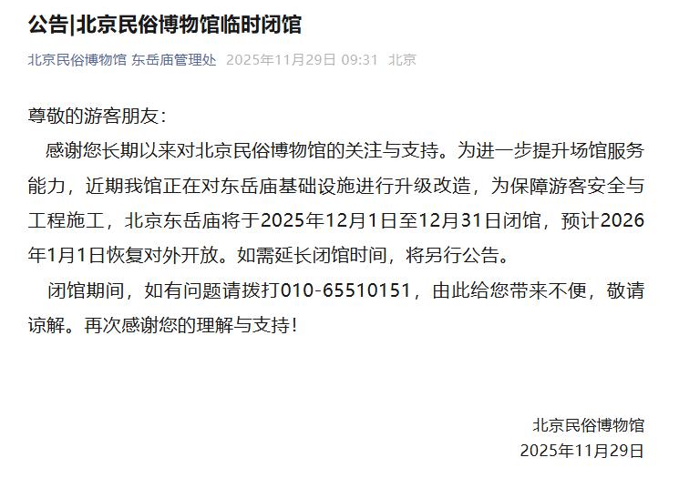 北京民俗博物馆东岳庙于 2025 年 12 月 1 日至 12 月 31 日闭馆,预计 2026 年 1 月 1 日恢复对外开放,如需延长闭馆时间,将另行公告。