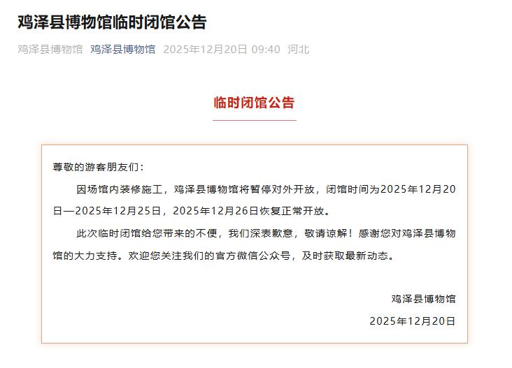 因场馆内装修施工,鸡泽县博物馆将暂停对外开放,闭馆时间为 2025 年 12 月 20 日— 2025 年 12 月 25 日,2025 年 12 月 26 日恢复正常开放。