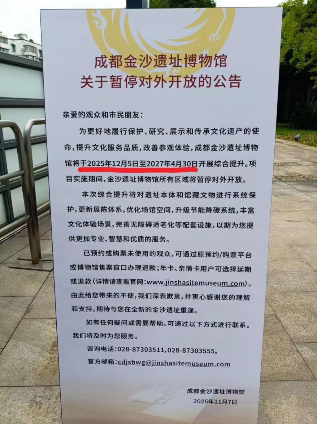 记者从微信公众号中了解到,成都金沙遗址博物馆将于 2025 年 12 月 5 日至 2027 年 4 月 30 日开展综合提升,期间馆内所有区域将暂停对外开放。