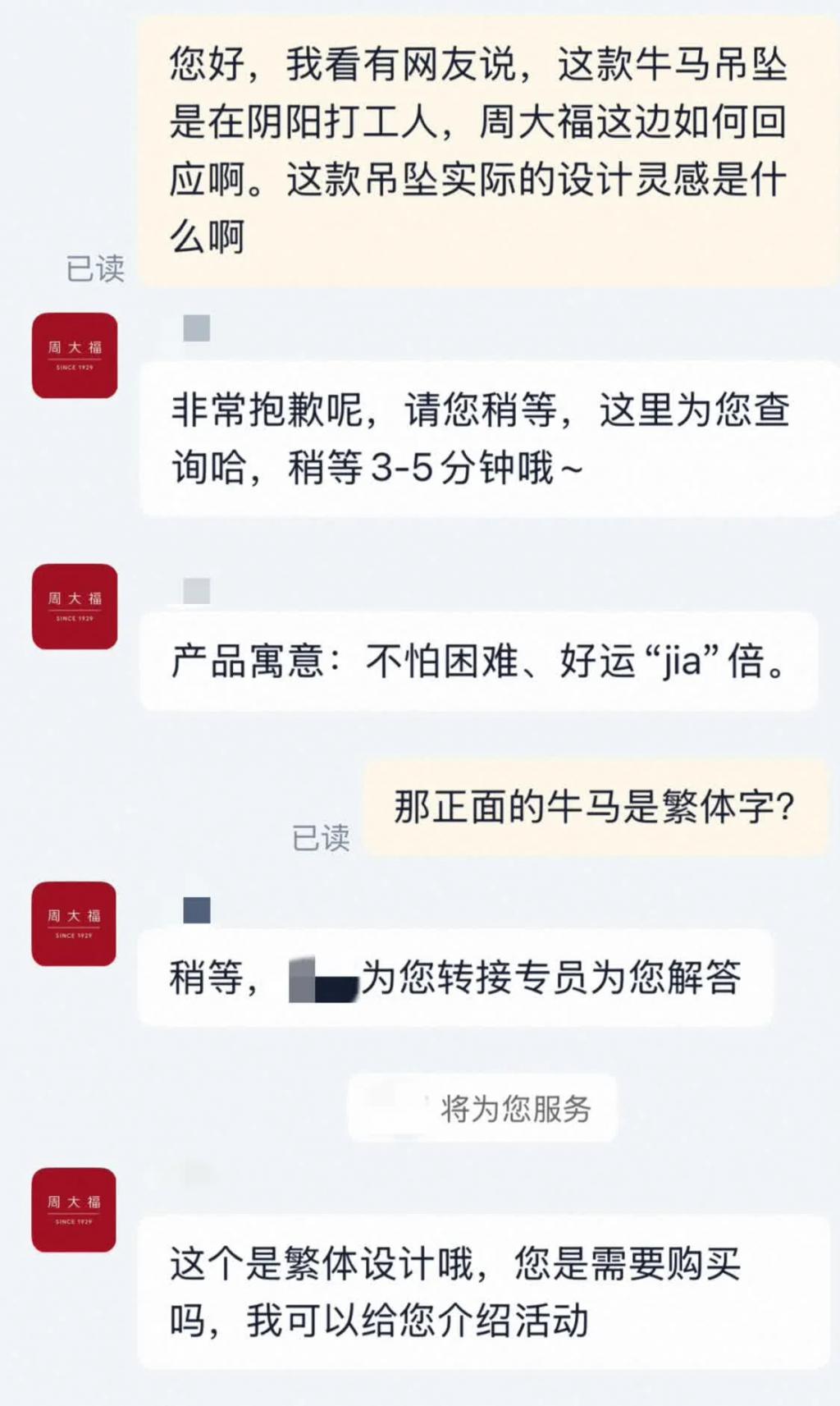 12 月 26 日,记者就此事咨询了周大福某电商平台官方旗舰店的客服。客服回应称,该款产品的寓意为不怕困难、好运 "jia" 倍,正面的 " 牛马 " 为繁体设计。