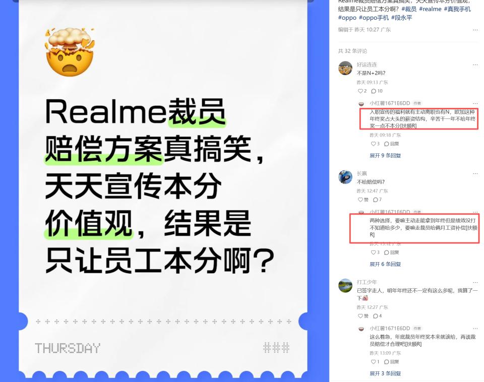 热点科技注意到,真我手机裁员爆料者水滴科技在社交平台仅此一篇作品,且没有官方认证头衔;甚至有人放出了 realme 裁员的赔偿方案,不过该爆料者也仅此一篇作品,看起来更像造谣小号,整体可信度不高。