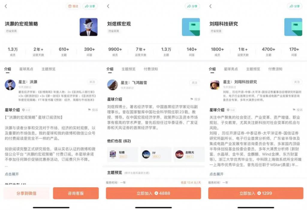 10 月底,曾任交银国际策略主管的洪灏正式宣布进军知识付费,其亮眼成绩随后引爆舆论。其知识星球账号 " 洪灏的宏观策略 " 订阅费为 899 元 / 年,不到两周就有 9500 多名成员加入,累计吸金超 850 万。两个月过去,其星球累计吸引成员超 1.3 万名,保守估计该部分收入已超千万。