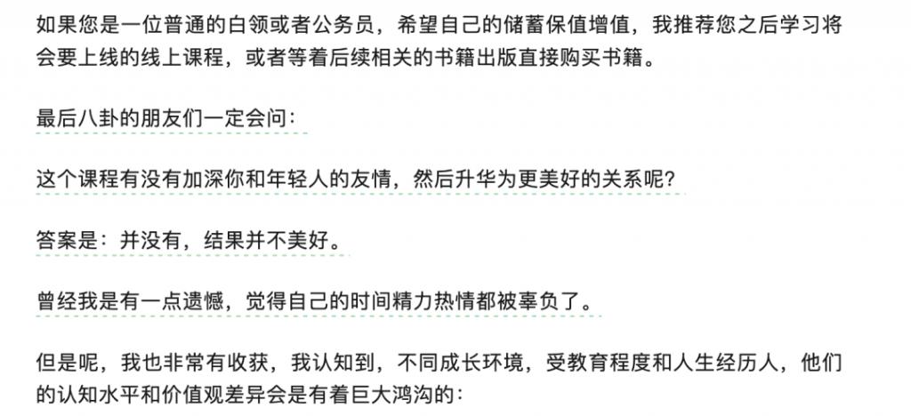 另一核心的争议话题在于,李蓓是一位深谙传播之道的 " 流量高手 "。除了高调的投资观点,她还经常公开分享个人生活、情感经历等。比如在近期两篇关于付费课程介绍和回应的文章里,李蓓还坦诚地分享了一个和年轻人的、结局并不美好的友情故事——相关表述部分是文章划线转发频次最高的,甚至高于她说个人目标是 " 后续职业生涯的年化收益率 20% 到 30%"。