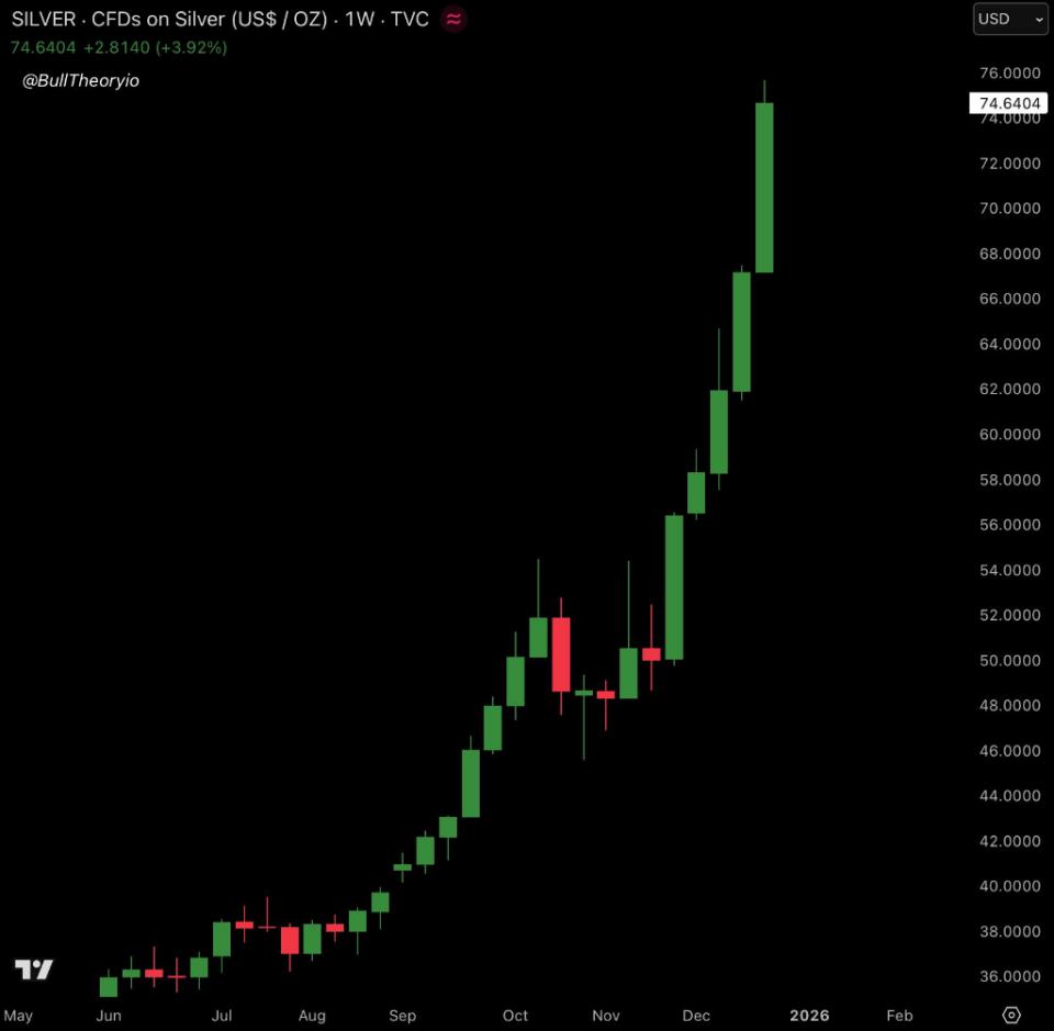 本周白银首次逼近 80 美元 / 盎司,迅猛涨势远超黄金。27 日,马斯克表达了担忧。直言这对工业发展 " 不是好事 "。