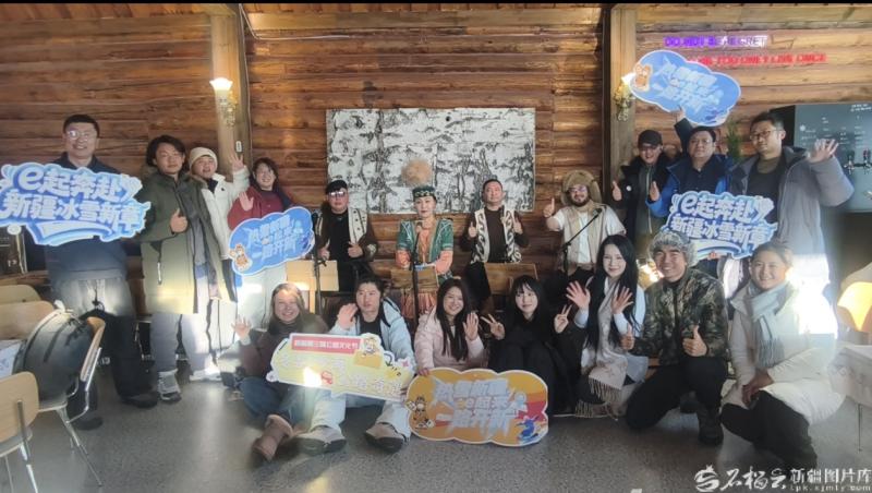 热雪新疆 e 起来 · 一路开 " 新 " 网络名人代表,在禾木百年老屋合影留念。石榴云 / 新疆日报记者 宋海波摄