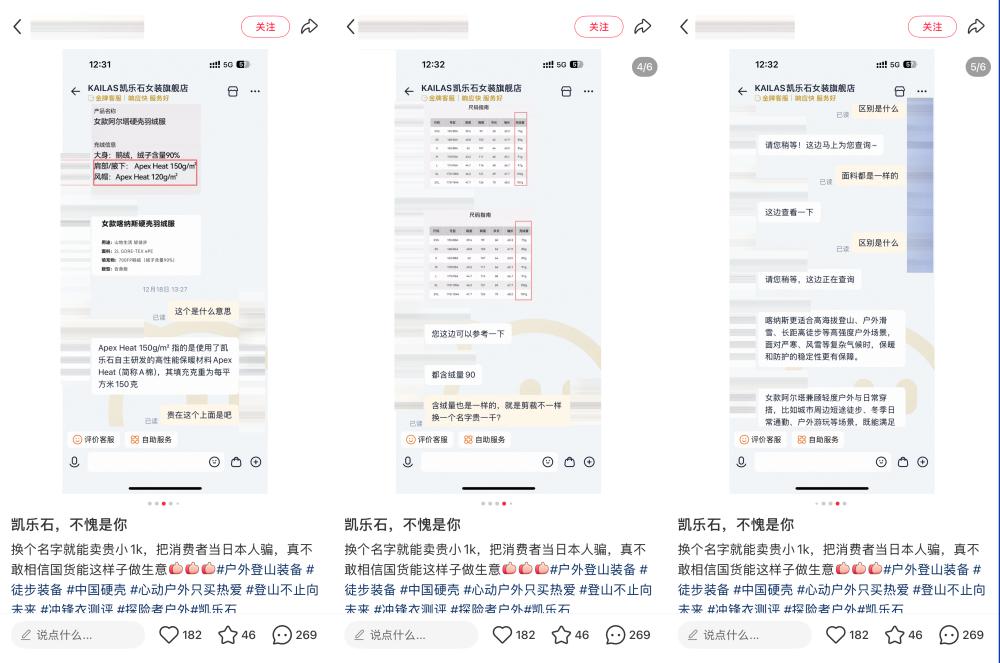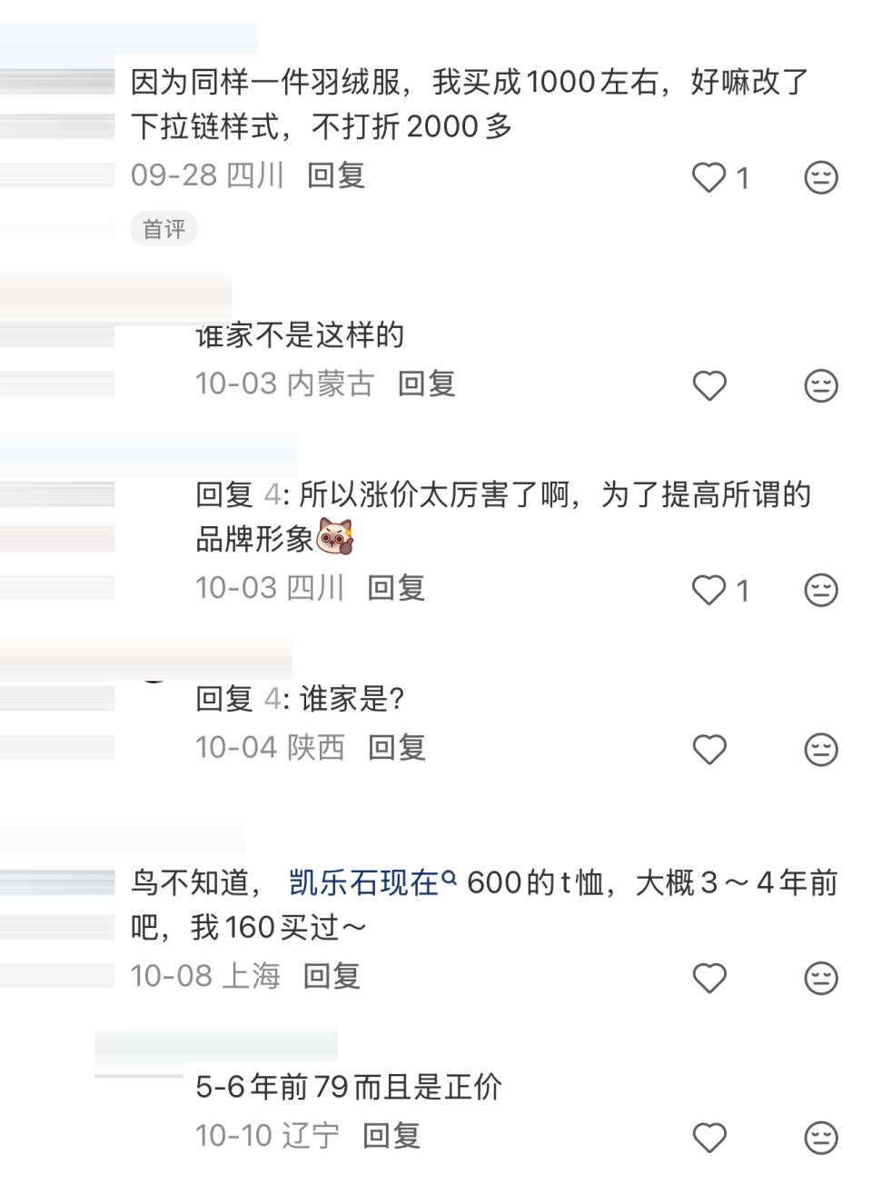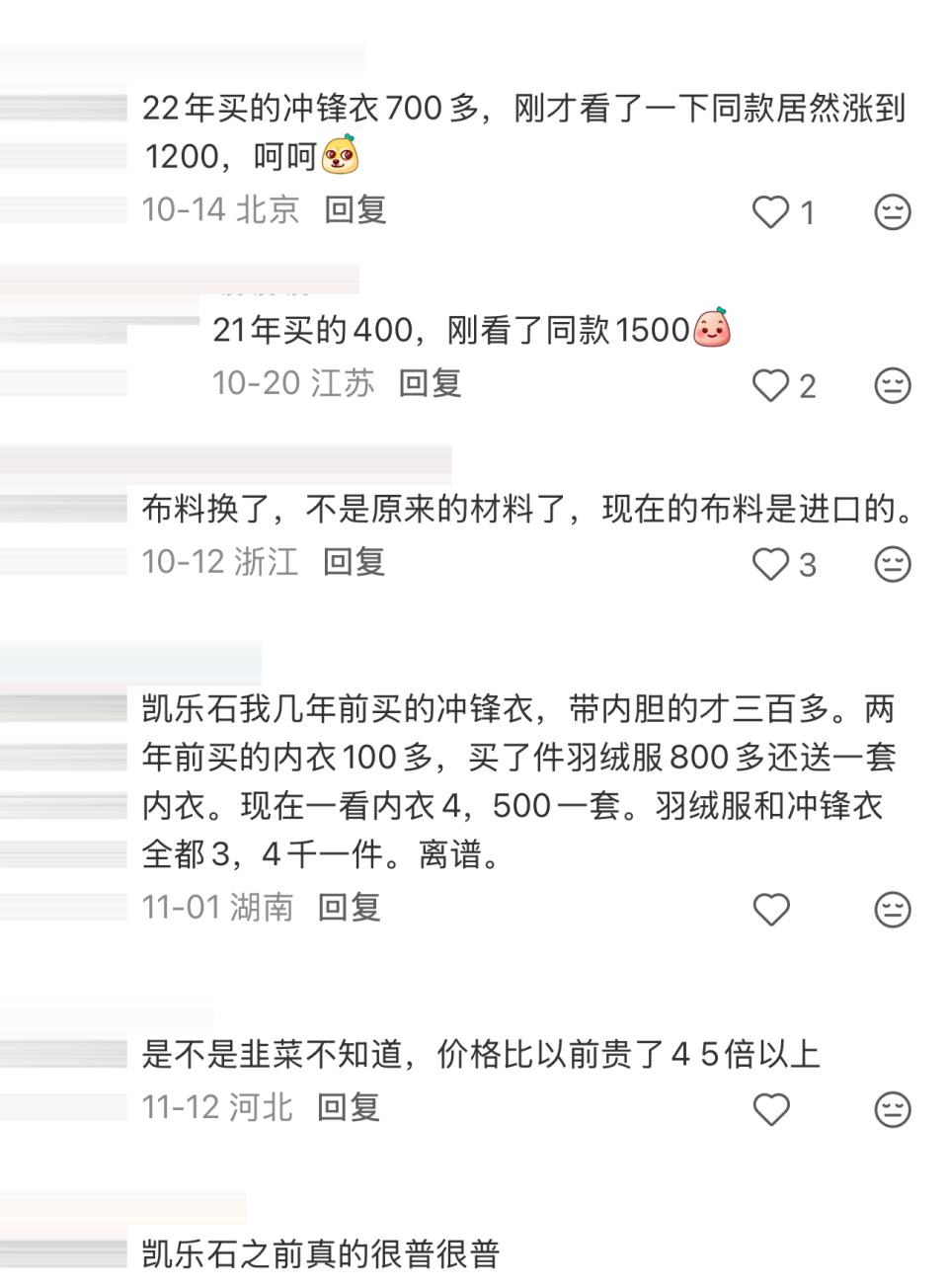 在某社交媒体平台上,关于凯乐石价格的讨论时有发生。有消费者表示," 凯乐石现在 600 的 t 恤,大概 3~4 年前吧,我 160 买过。" 也有消费者表示:" 布料换了,不是原来的材料了,现在的布料是进口的。"