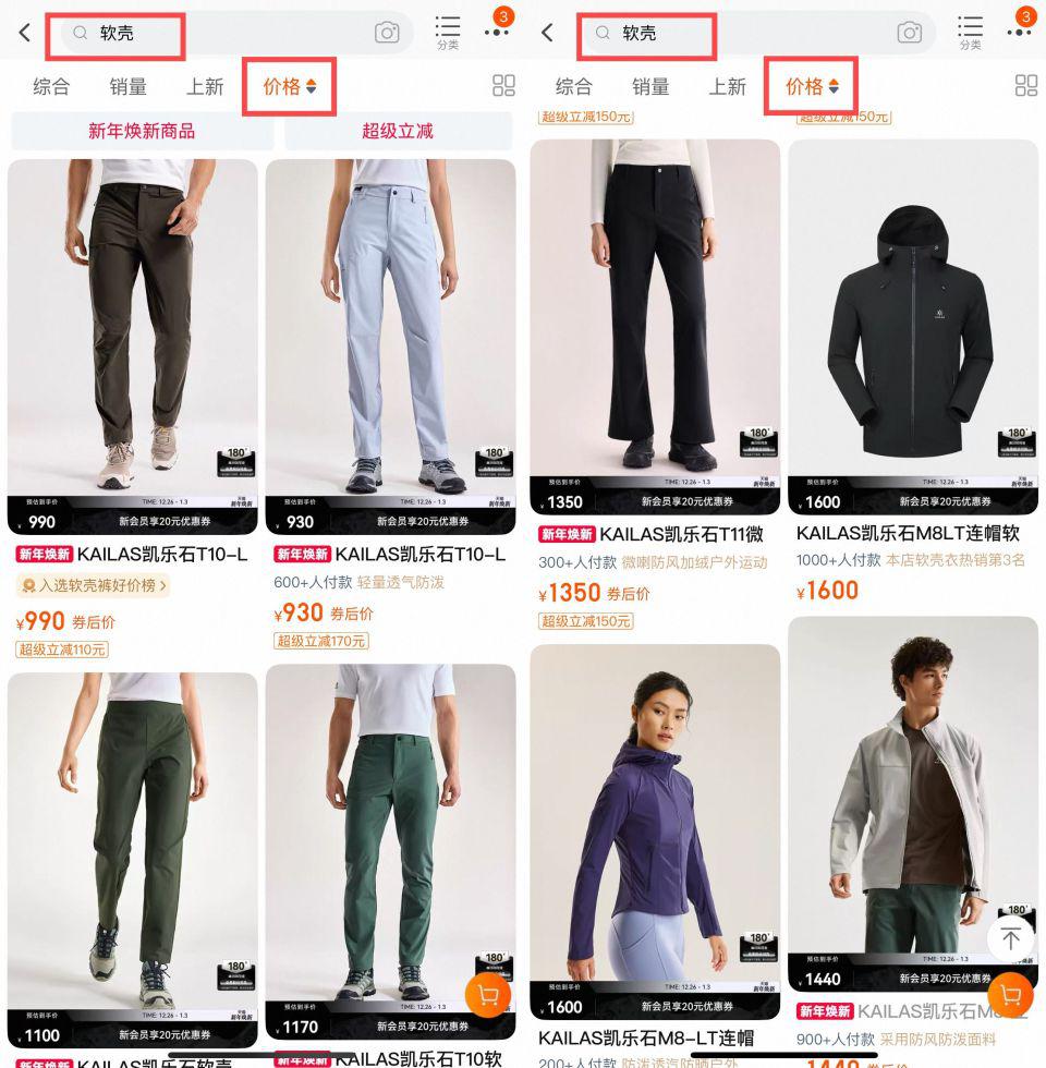 腾讯财经在官方旗舰店搜索发现,按价格从低到高排序,目前最便宜的软壳裤售价达 930 元,徒步衣则要 1600 元。