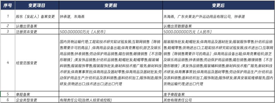 股东结构调整方面,原股东为钟承湛、朱海燕两位自然人,变更后新增 " 广东央莫龙户外运动用品有限公司 " 作为股东,形成新的三方股东架构。