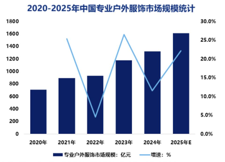 据智研咨询 12 月 27 日发布的报告显示,近年来,随着滑雪、徒步、登山等户外运动的普及,户外服装市场需求持续增长,行业规模不断扩大。2024 年中国专业户外服饰行业市场规模从 2020 年的 712 亿元增长至 1319 亿元,预计 2025 年中国专业户外服饰行业市场规模有望突破 1600 亿元。