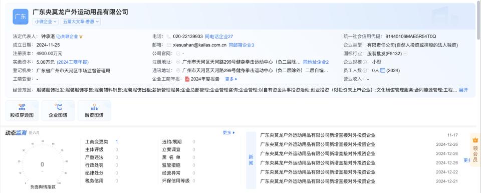 据企业预警通显示,广东央莫龙户外运动用品有限公司的法定代表人为钟承湛,投资凯乐石比例达 81.8182%。