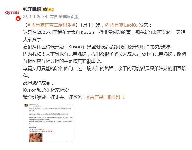 2026 年元旦,古巨基一条 " 感恩愿望成真 " 的微博,直接让全网沸腾了。官宣二胎出生本不稀奇,但据悉妻子陈韵晴的年龄已经 58 岁——这个消息,瞬间将喜讯升级成了关于家庭温情与生命奇迹的双重惊叹。