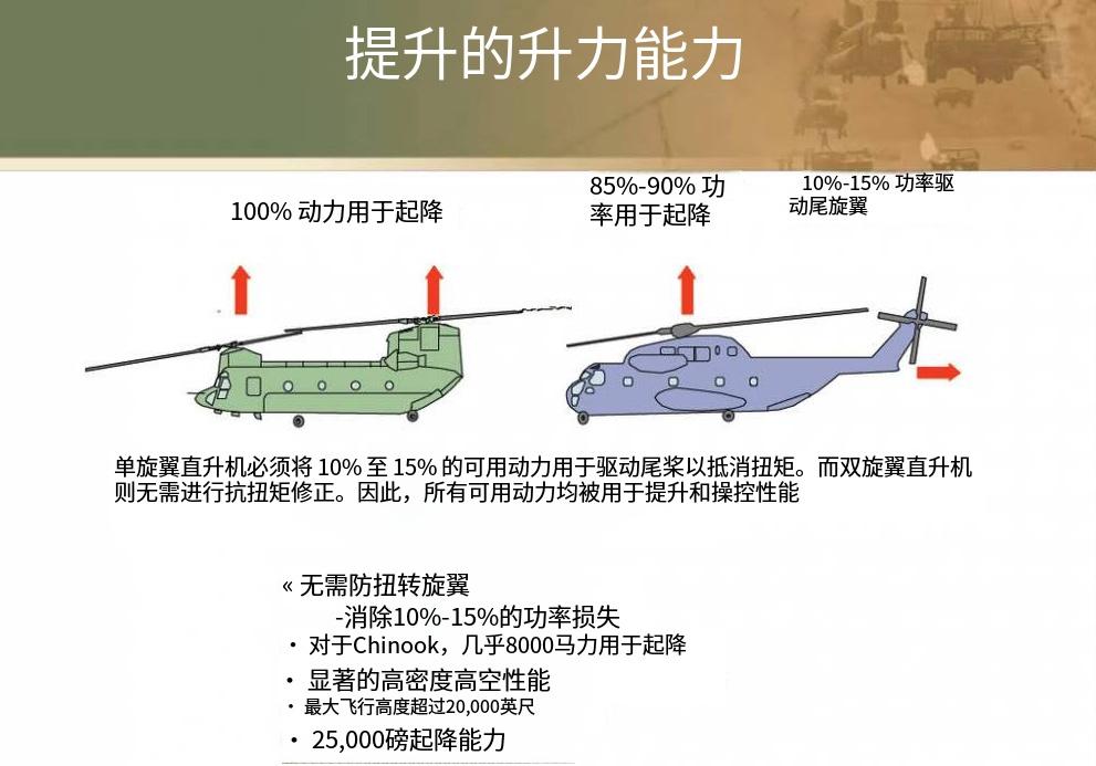 纵列双旋翼结构也使得前后两个旋翼都会产生升力和水平方向推力,没有了横向发力的尾翼,发动机的功率就可以全部输送给提供升力的旋翼,有效载荷得到明显提升,而且由于重心范围大,故而可以将直升机的空间设计得非常大。