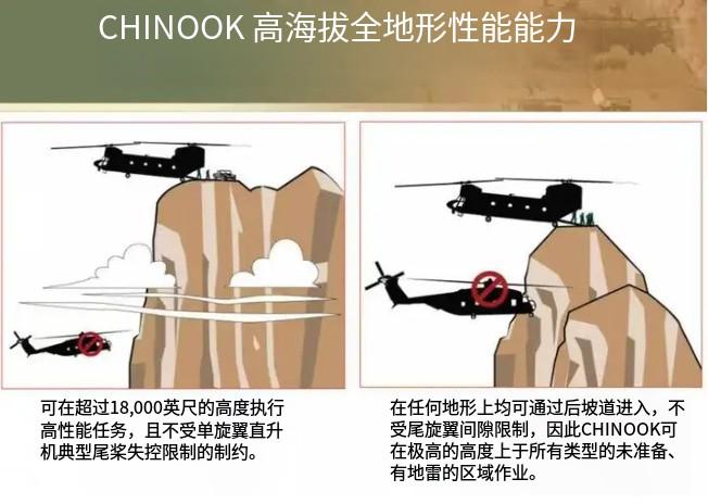 由于机身货舱尺寸大,悬停时会有较大的俯仰阻尼,抗侧风干扰的能力也非常不错,所以总能看到 " 支奴干 " 就悬在悬崖边上供士兵上下,要知道这悬崖旁边的侧风可是很猛的,一般飞机还真不敢这么干。