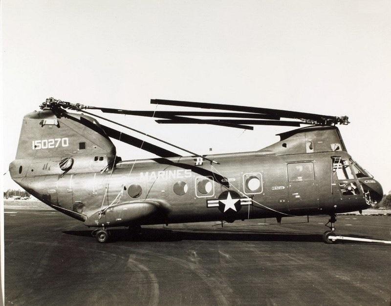 ▲同为纵列双旋翼设计的 CH-46" 海骑士 ",占地面积就比同级别的黑鹰直升机更小