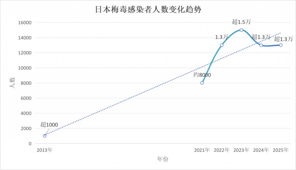 最近十多年,日本梅毒感染者人数整体呈增加趋势。2013 年日本报告的梅毒感染病例仅 1000 多例,从 2022 年增至 1.3 万例开始,连续 4 年确诊病例数保持高位。