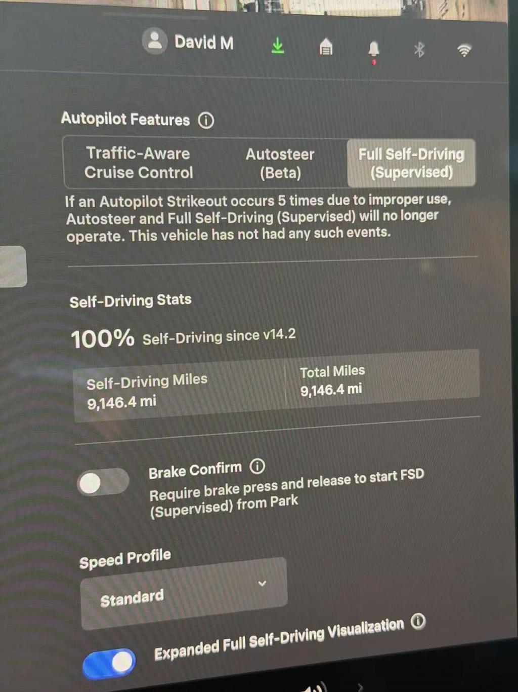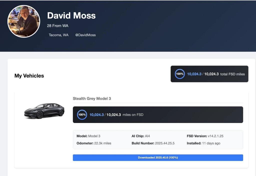 FSD 行驶 10000 英里认证 图片来源:大卫 · 莫斯社交媒体账号