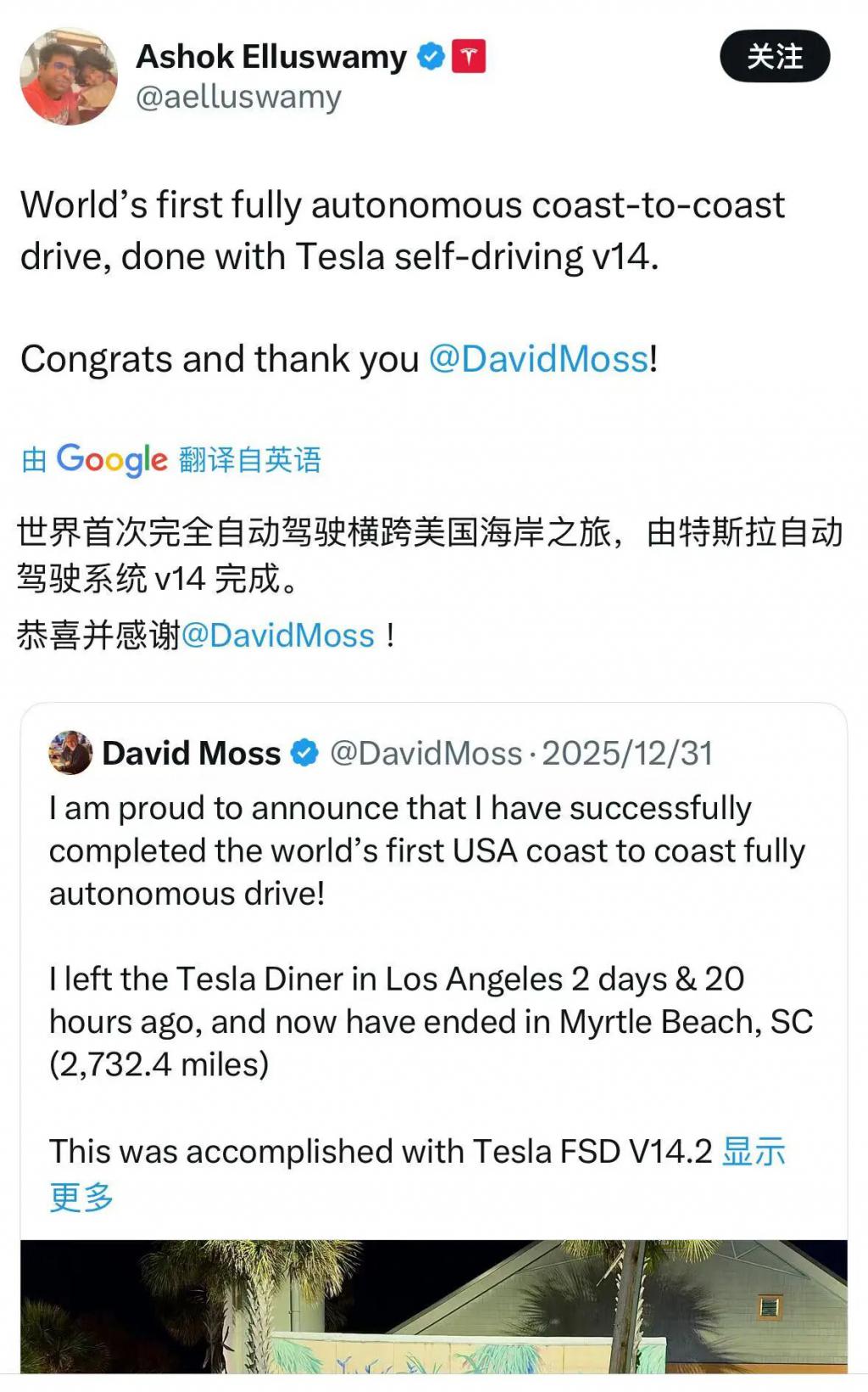 这是全球首次、数据可验证的依靠 FSD 跨美之旅,也让埃隆 • 马斯克 2016 年 " 让汽车自己横穿美国 " 的愿望成为现实。