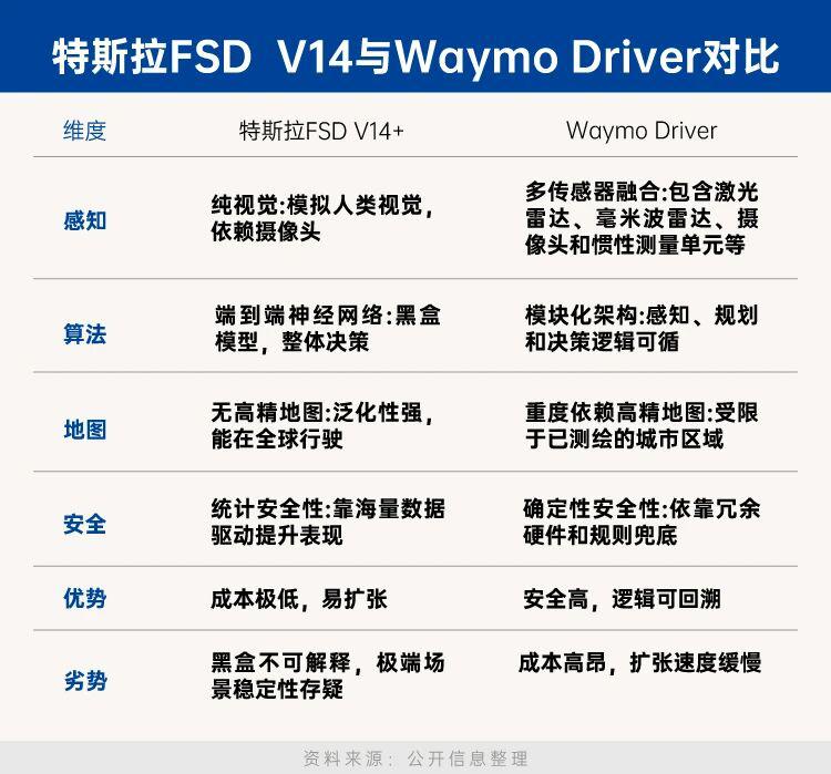 但是," 纯视觉 " 方案并非毫无争议。行业普遍认为,其在极端光照、恶劣天气下的感知盲区仍是核心痛点,而 Waymo 的多传感器融合路线则在这些场景中更具优势。