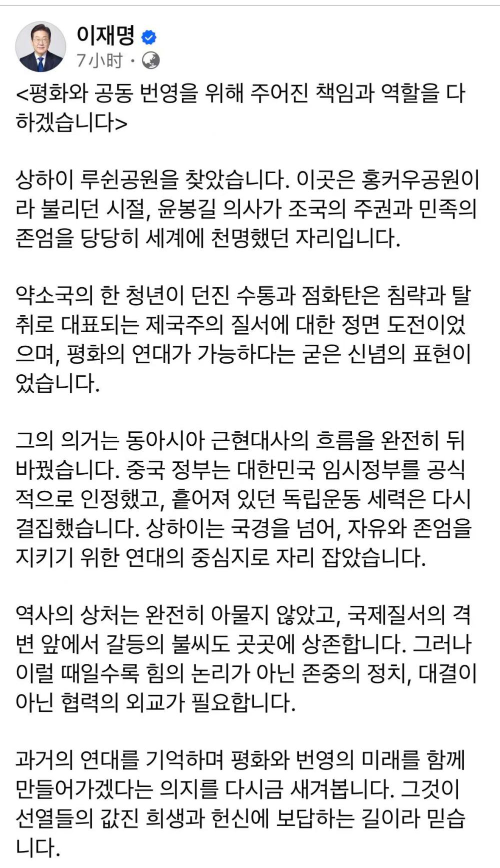 李在明写道:" 我寻访了上海鲁迅公园。这里曾被称作虹口公园,是尹奉吉义士向世界堂堂正正彰显祖国主权与民族尊严的地方。一位弱小国家的青年掷出的水壶与炸弹,是对以阴谋和脱逃为代表的帝国主义侵略的正面挑战,更是和平团结可期的坚定信念的体现。"(由 AI 翻译)