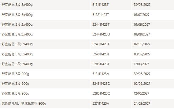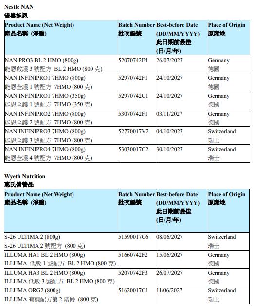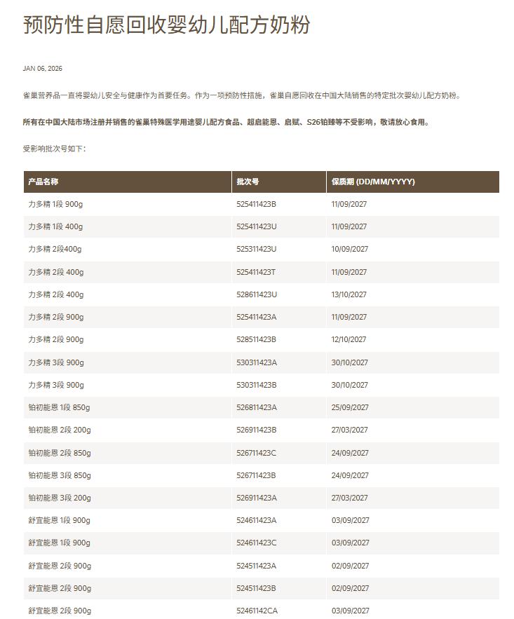 雀巢大中华区也在官网发布了预防性自愿回收婴幼儿配方奶粉的公告——涉及进口自欧洲、在中国大陆跨境电商销售的婴幼儿配方奶粉共 41 个批次产品;在中国大陆市场注册并销售受影响的产品包括:力多精、铂初能恩、舒宜能恩、惠氏膳儿加四大品牌 30 个批次产品。