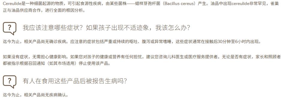 (雀巢集团官网对召回产品作的解释,提到蜡样芽孢杆菌以及婴幼儿食用后可能出现的不适症状,下图为翻译版)