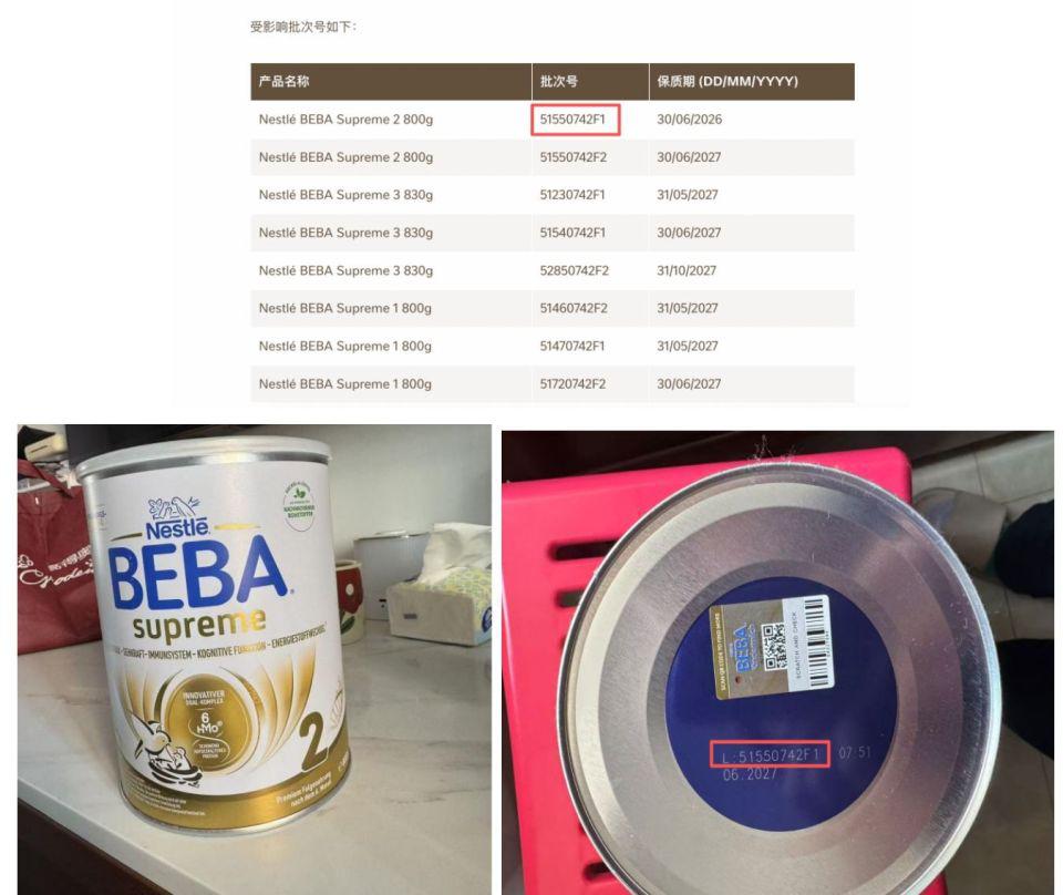 楚楚所购买的雀巢贝巴至尊奶粉(Nestlé BEBA Supreme)批号,在本次雀巢主动召回的奶粉清单中 受访者供图