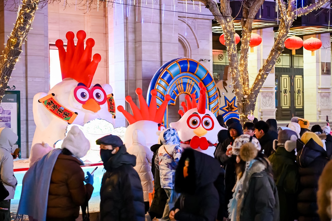 而在中央大街,中国工商银行旁的“发财鸡王”雪雕则更注重情绪共鸣。雕塑头顶红冠,手持“财源滚滚”对联,怀抱聚宝盆,寓意新年好运。正新鸡排的玩偶巡街,与游客互动合影,将情绪价值拉满,它还给游客派发了福利彩票,让运气延续一整年。这种设计满足了人们在冬日寻求温暖和讨个好彩头的心理,让品牌形象自然融入年轻人社交分享的场景,给“鸡王”增强了传播力。