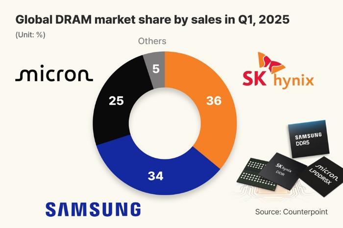全球前三大存储芯片厂商,韩国就占了两个。全球第一是三星,第二是 SK 海力士,第三则是美国镁光半导体了。而三星与海力士两家呢,就逼近 70% 了。再加上镁光的话,三大巨头在存储芯片领域,综合市占率高达 90% 以上。