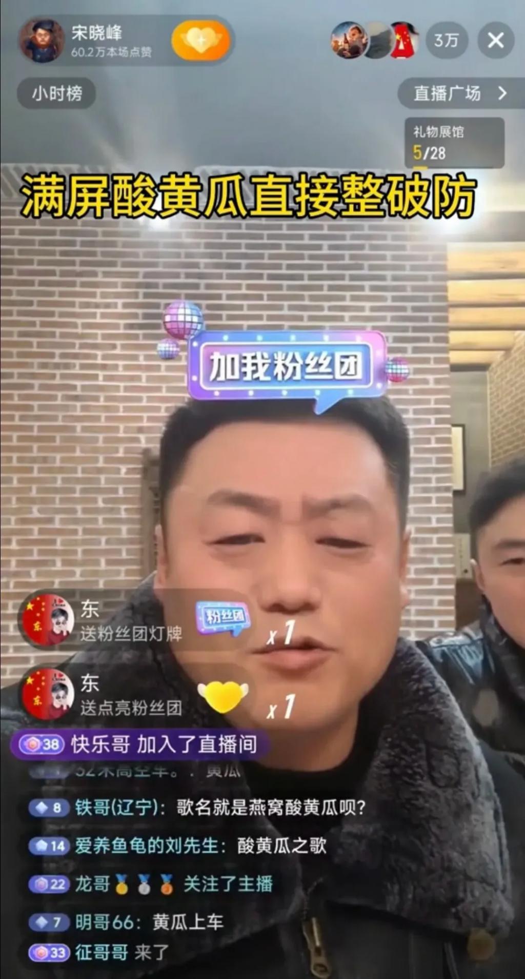 1 月 6 日晚,曾在大型连续剧《乡村爱情》中出演象牙山庄保安队长一角,并以口吃特征闻名的演员宋晓峰,正热火朝天地在直播间宣传自己的新歌《我的东北老家》,人气冲到两万多。没想到,直播中途画风突变,弹幕区突然被铺天盖地的 " 酸黄瓜 " 三个字彻底刷屏,正常互动完全被淹没。