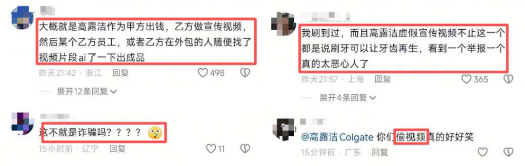 评论区中,网友纷纷发表意见。有网友认为这是在 " 偷视频 " 和 " 诈骗 ";也有网友分析,这是高露洁外包的广告团队随便找视频进行 AI 处理,获得众多点赞。