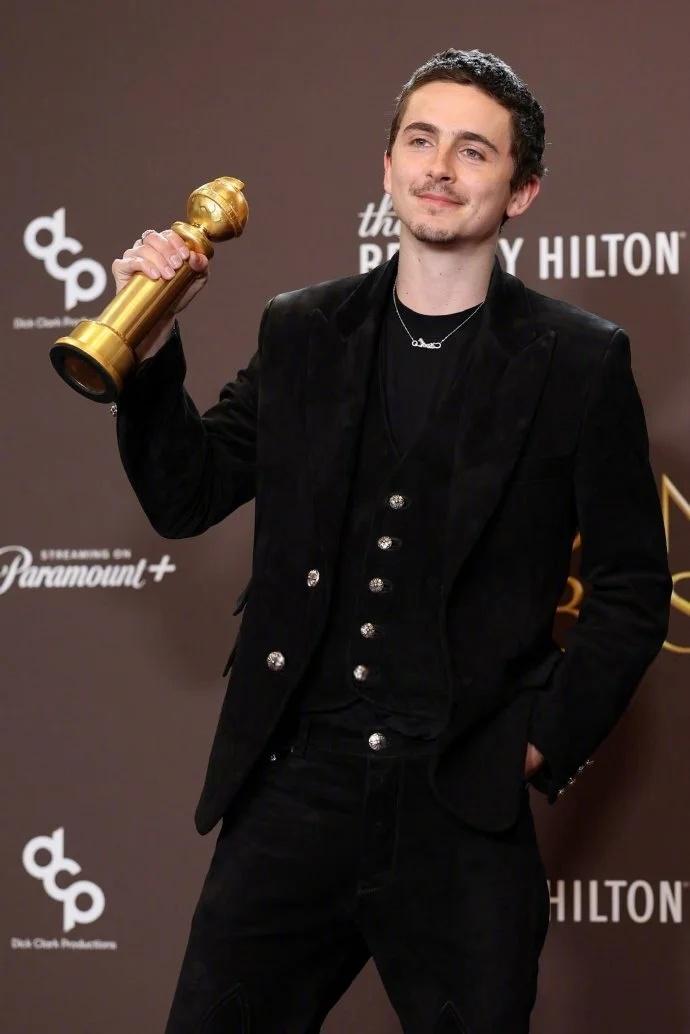 提莫西 · 查拉梅凭 ( 甜茶)《至尊马蒂》首夺金球奖影帝,以 30 岁成为该类别史上最年轻得主,领奖时他感谢了伴侣凯莉 · 詹娜并与之深情相拥亲吻。