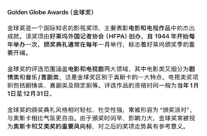 金球奖不仅是全球知名奖项,也是奥斯卡的风向标之一。