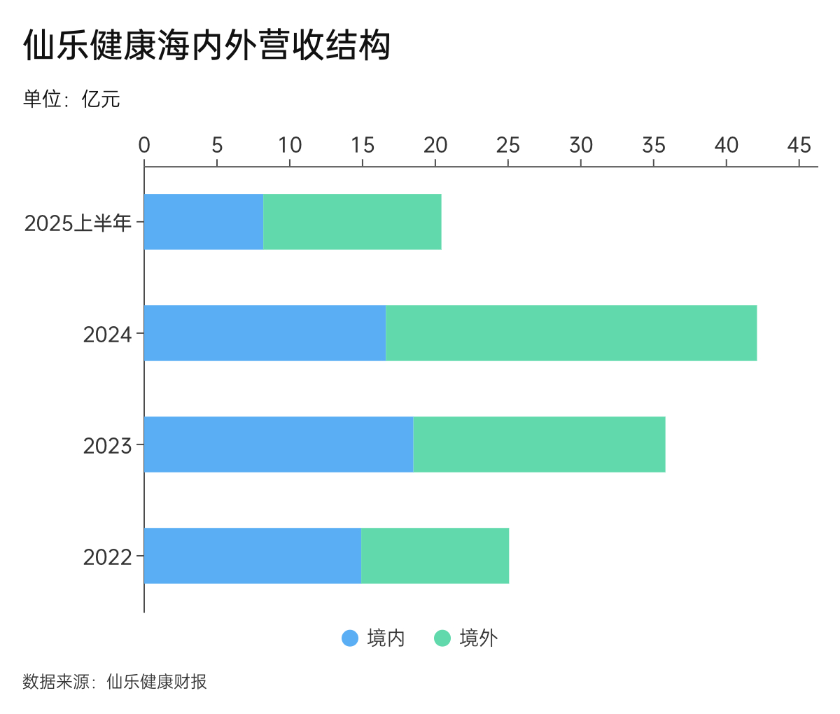 据财报,2022年至2024年,仙乐健康国内业务营收14.91亿元、18.5亿元和16.6亿元,同比2.28%、24.11%和-10.28%。2025年上半年,仙乐健康国内业务营收8.18亿元,同比-1.63%。