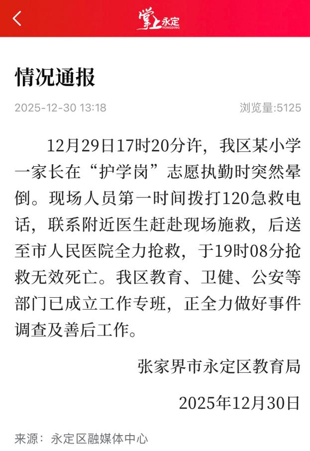 2025 年 12 月 29 日 17 时 20 分许,永定区某小学一家长在 " 护学岗 " 志愿执勤时突然晕倒。现场人员第一时间拨打 120 急救电话,联系附近医生赶赴现场施救,后送至市人民医院全力抢救,于 19 时 08 分抢救无效死亡。我区教育、卫健、公安等部门已成立工作专班,正全力做好事件调查及善后工作。