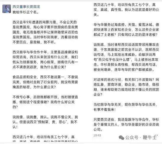 贾国龙回忆,西贝于去年 9 月遭遇网暴污蔑,彼时凡为西贝发声者均会遭到网暴攻击,华杉因出面支持西贝,不仅自身被全网嘲弄,其执掌的华与华公司的客户也受到连带威胁。