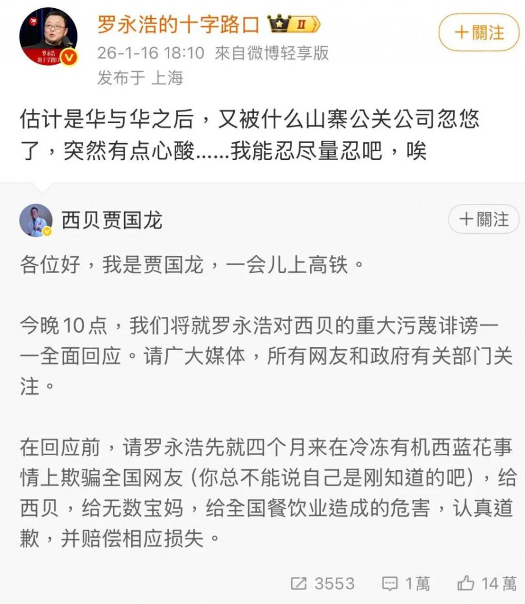 ▲ 1 月 16 日下午,罗永浩回应贾国龙喊话道歉。