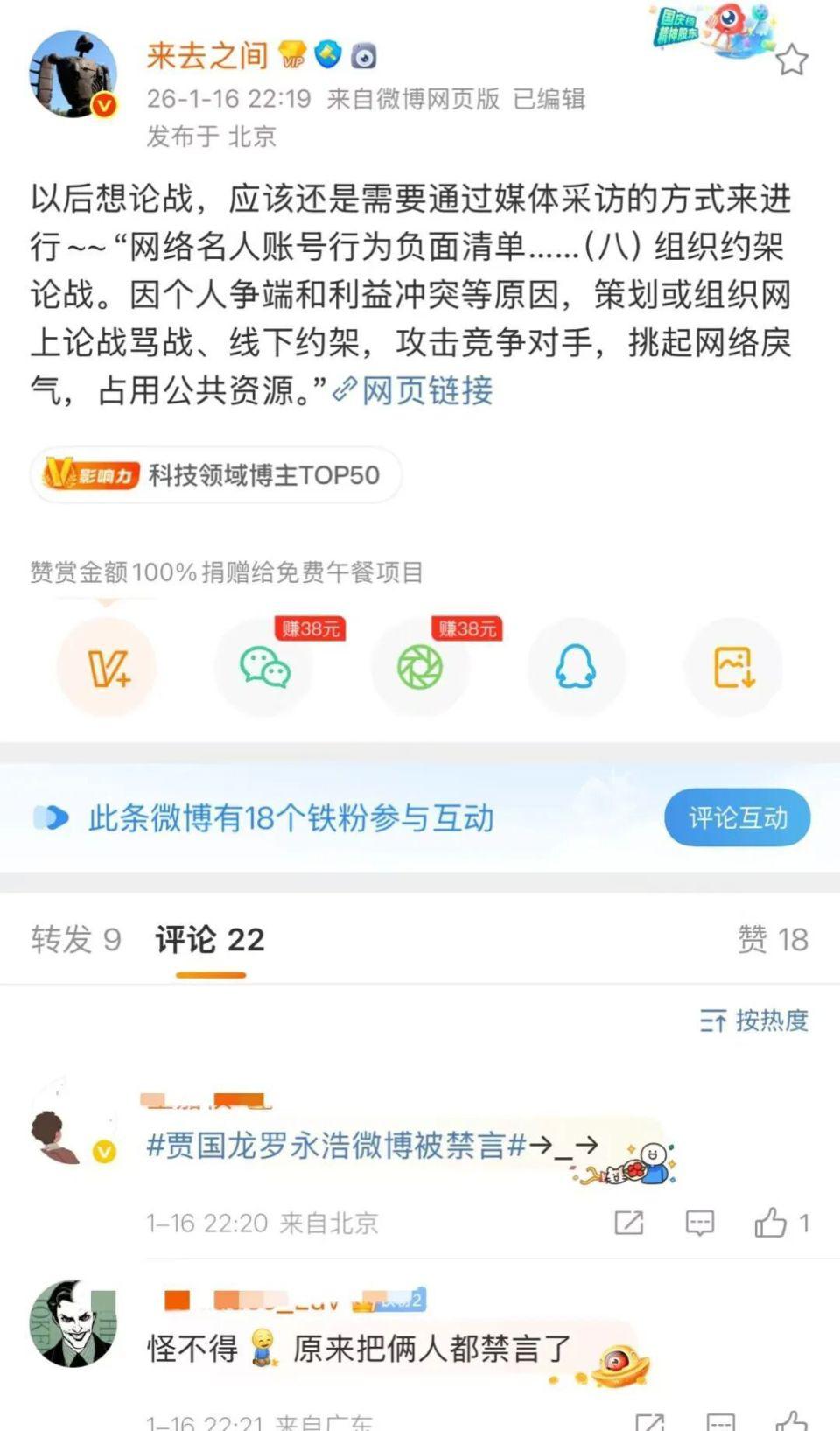 此前,有记者从罗永浩方面相关人士处获悉,罗永浩以及贾国龙双方微博账号均被禁言。随后,微博 CEO" 来去之间 " 提到,两人的行为涉嫌网络名人账号负面清单中的 " 组织约架论战 ",即因 " 个人争端和利益冲突等原因,策划或组织网上论战骂战、线下约架,攻击竞争对手,挑起网络戾气,占用公共资源 "。