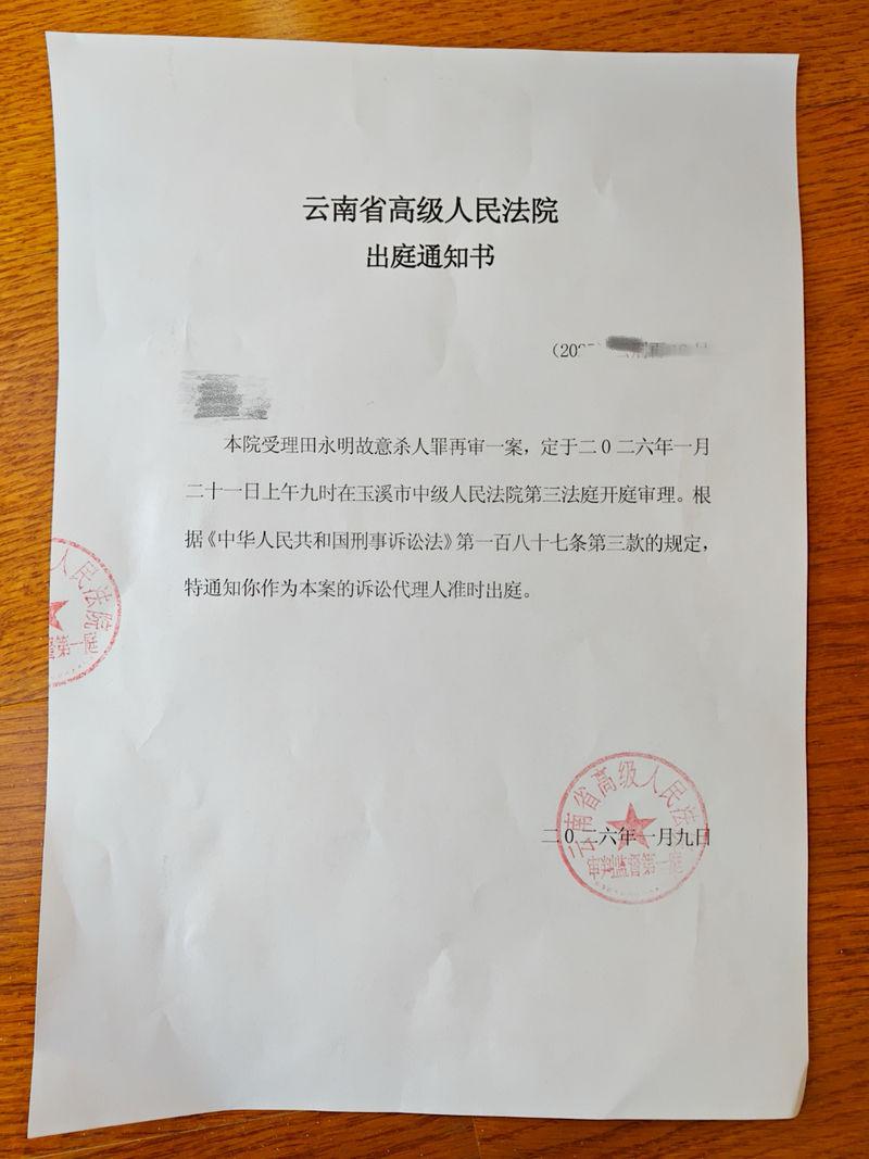 1 月 21 日上午,田永明故意杀人案再审开庭。图为相关诉讼代理人收到的出庭通知书。受访者供图