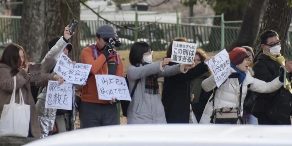 一些日本市民在奈良地方法院外举牌要求轻判山上