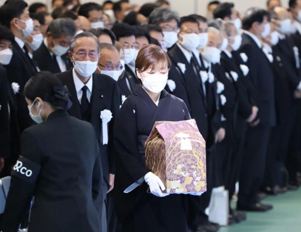 2022 年 9 月 27 日,安倍夫人手捧丈夫骨灰盒,出席国葬。