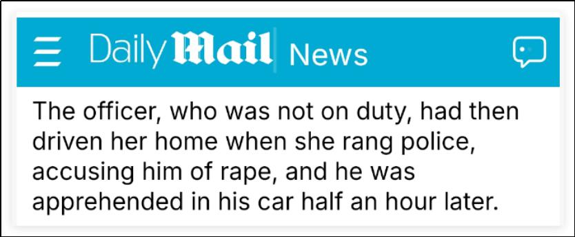 完事儿后不到半小时,在警察开车送她回家的路上,他们吵了起来。没多久她报警说警察强奸了她。