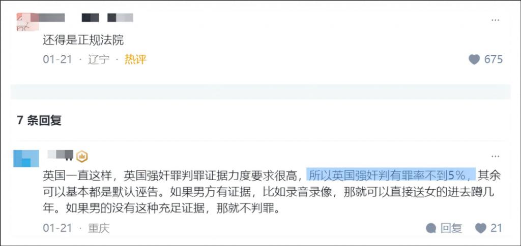 这时候很多人还会补充说,有数据有真相,你看英国强奸定罪率低到 5%,被诬告告怕了。