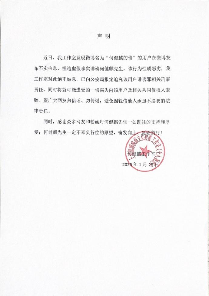 随后,@何健麒 SEVEN-7 工作室 发布严正声明,称已向公安局报案并追究该用户诽谤罪及相关刑事责任。